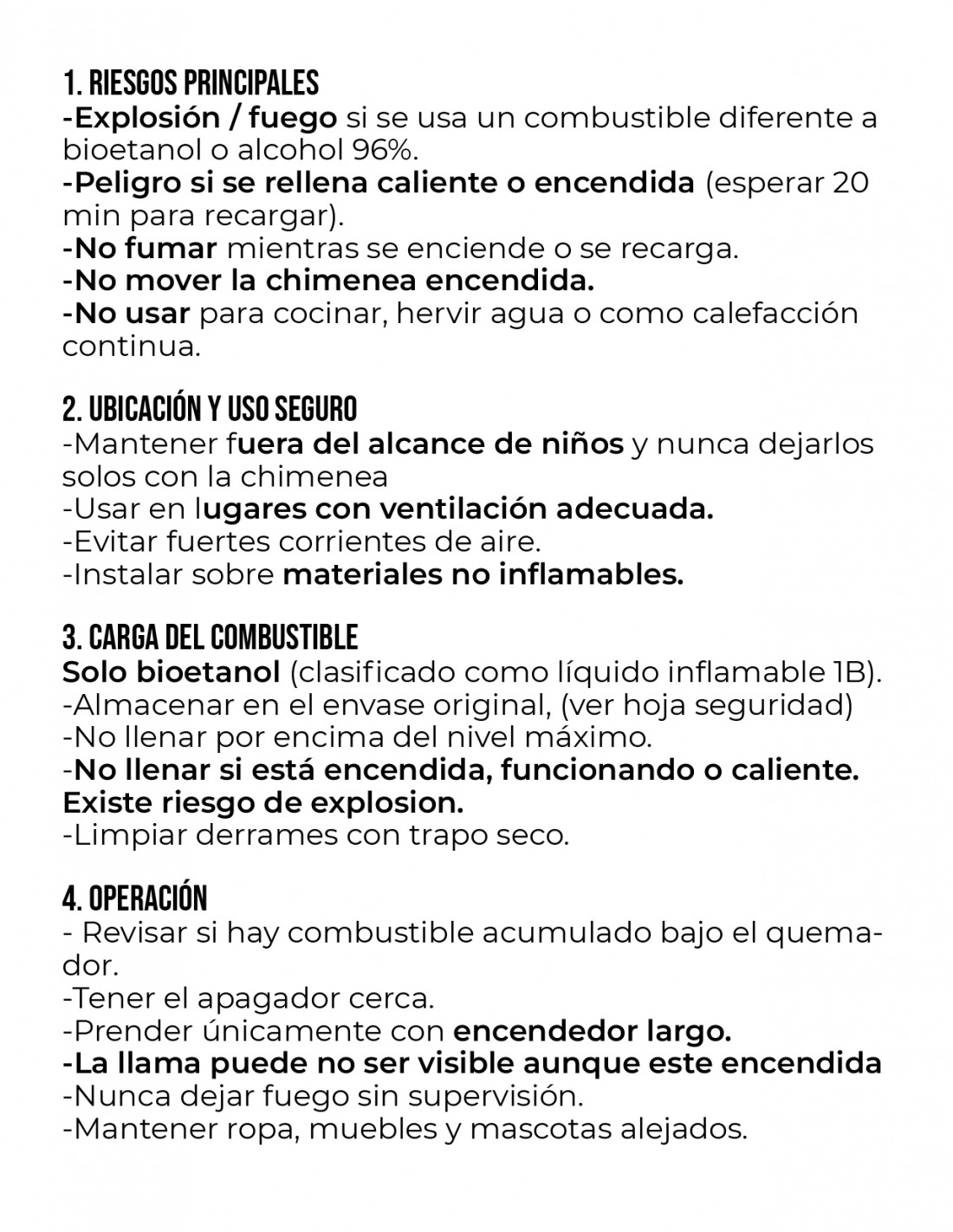 -RIESGO DE EXPLOSIÒN SI SE CARGA EL LIQUIDO MIENTRAS LA CHIMENEA ESTE ENCENDIDA